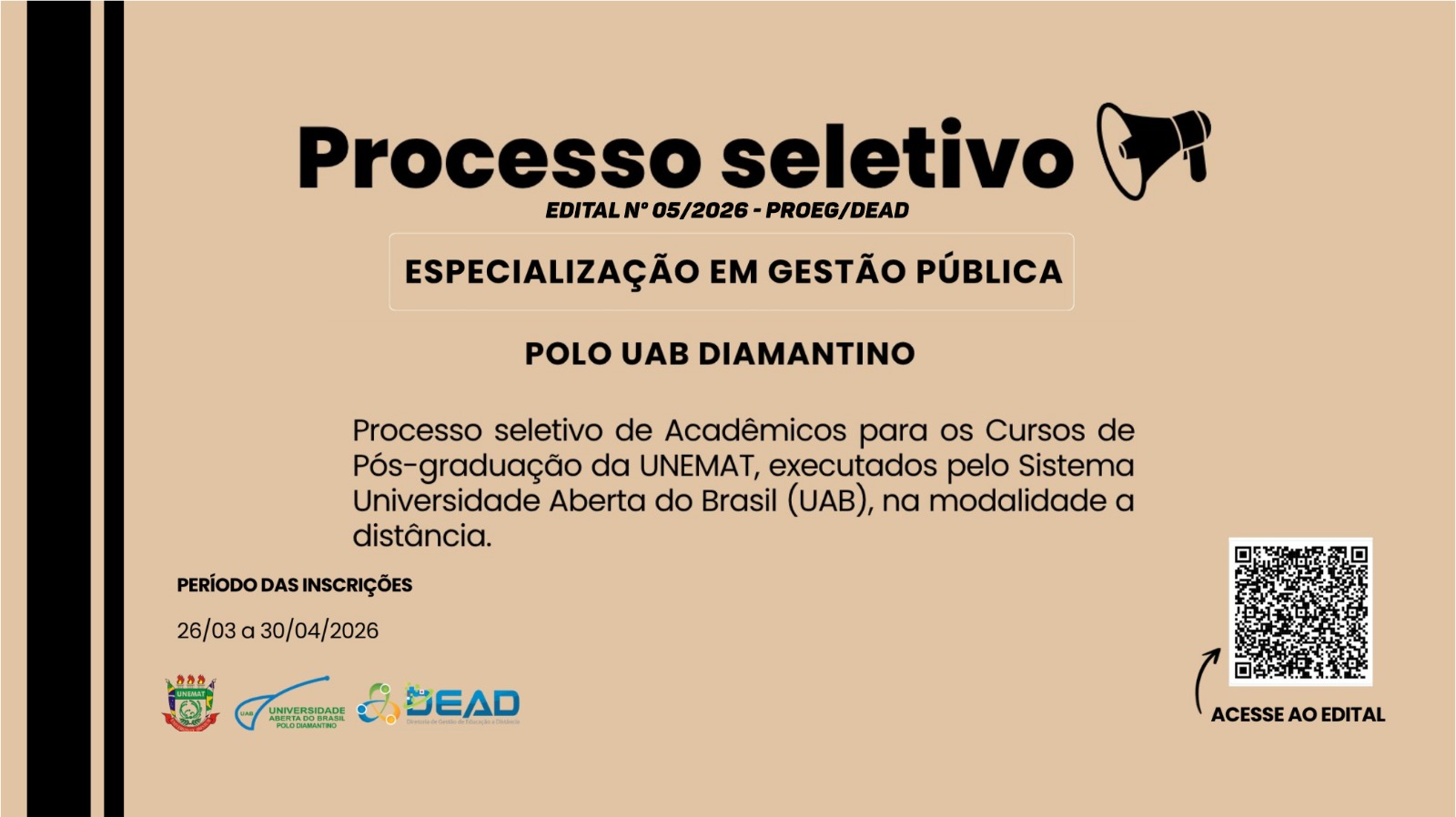 A Universidade do Estado de Mato Grosso (Unemat), por meio da Universidade Aberta do Brasil (UAB) Polo de Diamantino, está com inscrições abertas para o processo seletivo da Pós-graduação Lato Sensu em Especialização em Gestão Pública, na modalidade de ensino a distância (EAD).